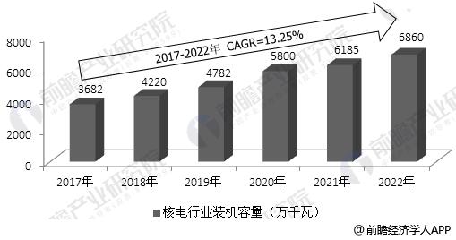 根據(jù)《核電中長期發(fā)展規(guī)劃(2011-2020年)》以及核電十三五規(guī)劃,前瞻產(chǎn)業(yè)研究院預(yù)判到2022年我國核電總體裝機(jī)容量將超過6800萬千瓦,在建裝機(jī)容量超過3000萬千瓦,2017-2022年均復(fù)合增長率在為13.25%,核電產(chǎn)業(yè)發(fā)展空間巨大。