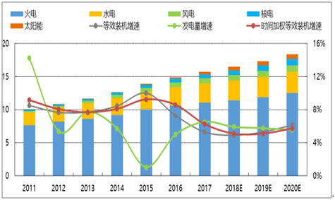 2018-2019 年發電設備利用率有望逐年改善, 2020 年小幅回落。 2014 年以來等效火電裝機和時間加權等效火電裝機增速均高于發電量增速,發電設備利用率逐年降低。 2017 年底等效火電裝機容量 15.7 億千瓦,同比增速 5.3%,時間加權同比增速 6.3%,低于發電量增速 6.5%,發電設備利用率開始改善。根據我們電力供應預測數據測算得到,2018-2020 年時間加權等效火電裝機增速分別為 5.1%、 5.1%、 5.7%,發電量增速分別為 5.9%、 5.8%、 5.6%。因此,2018-2019 年發電設備利用率料將較 2017 年逐年改善, 2020 年或將在 2019 年的基礎上小幅回落。