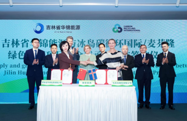 10月16日,正值冰島總統(tǒng)哈德拉?托馬斯多蒂爾訪華期間,2025可持續(xù)全球領(lǐng)導(dǎo)者大會在上海召開,大會主題活動——中國-冰島企業(yè)合作簽約儀式同期舉行,冰島總統(tǒng)哈德拉?托馬斯多蒂爾親臨現(xiàn)場。會上,吉林省華錦能源有限公司與冰島碳循環(huán)國際(CRI)/麥芬隆完成綠色甲醇項目暨全球承購合作簽約;中環(huán)新能源控股集團旗下中環(huán)新能源創(chuàng)新研究院有限公司,與吉林省華錦能源有限公司簽署戰(zhàn)略合作協(xié)議。