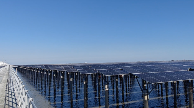 在呂四項目的安全日志里,記錄著大風天氣、暴雨預警、潮汐延誤作業等不同的數據,如何在惡劣環境下確保施工安全與效率,成為貫穿項目始終的必修課。項目團隊建立預警響應機制,以設計優化、工序協同破解困局,呂四項目的順利并網,展現出了他們向海要地、與浪共舞的智慧。通過團隊協作與科學調度,不僅成功克服了雨季施工難、大風頻發、潮汐作業窗口短等多重挑戰,更以安全優先為前提,實現了工期與質量雙達標,最終項目以光伏發電和漁業養殖相結合,形成“水上發電、水下養殖”的復合產業模式,在5800畝海域上實現灘涂資源的高效利用和生態開發。