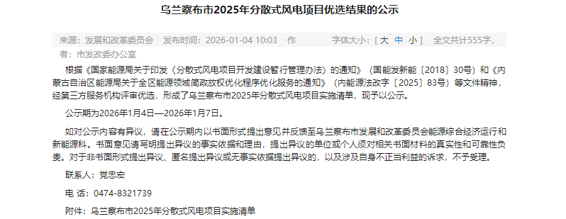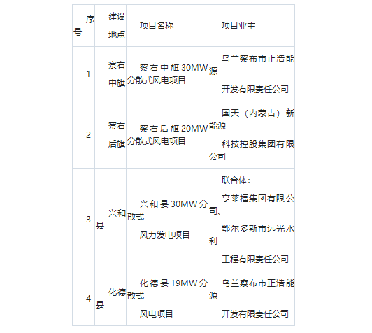 公告顯示,分散式項目共4個,規(guī)模99MW。烏蘭察布市正浩能源開發(fā)有限責(zé)任公司獲得49MW;國天(內(nèi)蒙古)新能源科技控股集團(tuán)有限公司獲得20MW指標(biāo);余下30MW指標(biāo)由亨萊福集團(tuán)有限公司、鄂爾多斯市遠(yuǎn)光水利工程有限責(zé)任公司組成的聯(lián)合體獲得。