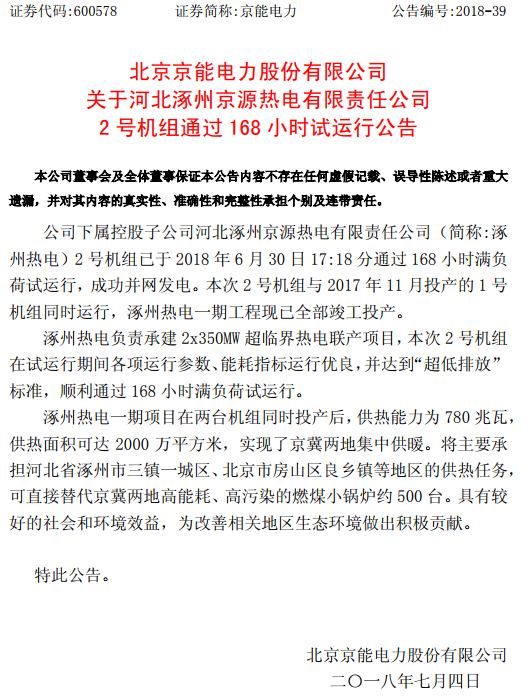 京能電力發布公告,下屬控股子公司涿州熱電2號機組已于6月30日17:18分通過168小時滿負荷試運行,成功并網發電。本次2號機組與2017年11月投產的1號機組同時運行,涿州熱電一期工程現已全部竣工投產。公告原文: