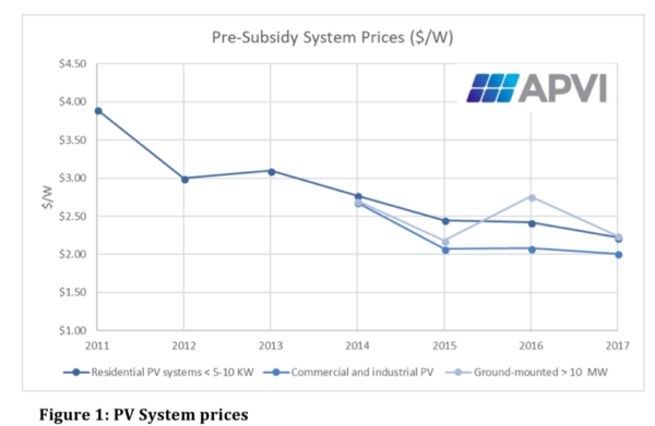 模塊價格下降 - 在2018年下半年中國光伏市場嚴重衰退的背景下 - 預計將在今年后期流入澳大利亞市場,從而提供年終增長。相比之下,APVI報告顯示,自2015年以來,光伏系統價格基本保持在2至2.50美元/ Wp(1.48-1.86美元)左右。