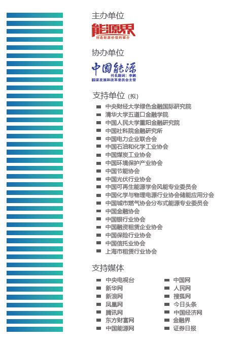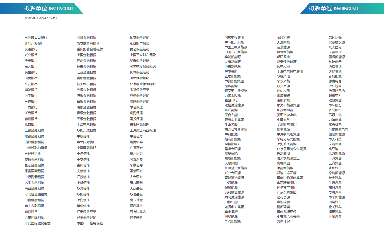 包容、開放、合作是“能金會”一貫主張,各路專家學(xué)者、行業(yè)大咖共聚一堂,為能源金融發(fā)展獻策獻力,實現(xiàn)行業(yè)的共享、共贏是大會不變的中心思想。據(jù)了解,第二屆“能金會”擬邀請國家級行業(yè)協(xié)會、重點科研院所、大型咨詢公司、銀行及各分行、融資租賃、保險信托、基金、證券、保理、資本、風(fēng)投、金控等金融機構(gòu)和央企及央企子公司、省市級地方國企、水電、儲能、太陽能、風(fēng)能、氫能、生物質(zhì)能、新能源汽車、節(jié)能、環(huán)保、分布式、創(chuàng)新技術(shù)、冷熱電聯(lián)產(chǎn)、綜合能源服務(wù)、能源EPC設(shè)計商、承建商等政府機構(gòu)、科研單位、能源企業(yè)和國內(nèi)權(quán)威媒體、行業(yè)媒體參會,會議規(guī)模預(yù)計將達700人。