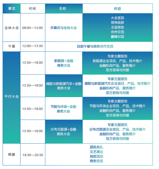 打破常規(guī),創(chuàng)新融合,是“能金會”一大特色。資料顯示,第二界“能金會”共分三大板塊,一是“開幕式與全體大會”,二是“平行大會”,三是“晚宴”,主題清晰、層次分明,而不失“有料”、“有溫度”。其中,“平行大會”分為“新能源+金融商務(wù)大會”、“儲能與新能源汽車+金融商務(wù)大會”、“節(jié)能與環(huán)保+金融商務(wù)大會”和“分布式能源+金融商務(wù)大會”四個單元,每個單元分別設(shè)置了專家主題報告、相關(guān)企業(yè)項目、產(chǎn)品技術(shù)推介、金融機構(gòu)產(chǎn)品、服務(wù)推介、和雙方咨詢與對接等環(huán)節(jié),將能源與金融業(yè)之間的無縫對接落到了實處。