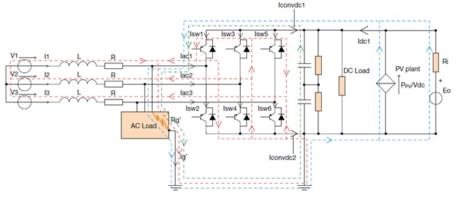 在交直流混合電網中直流負載側,顯然普通AC型剩余電流保護器無法完成保護,需要使用DC-RCD進行直流漏電保護,然而目前直流漏電保護還并未推廣和市場化,國內也尚無相關標準。實際上,在交直流混合微電網中,漏電成分是非常復雜的,我們來看下ABB對于交直流混合微電網中交流側接地故障的仿真模型。