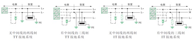 與交流配電系統一樣,直流配電系統的接地形式也分為TN、TT、IT,由于直流用電設備對供電電源要求有可能是負電源或正電源,因此配電系統中有兩條電源線的兩線制或增加一條中間導線(M線)的三線配電制。下圖3為配電系統常用的TT、IT接地形式的系統簡圖。
