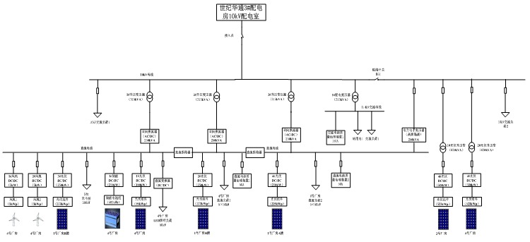 隨著分布式發電和儲能的大量應用和直流負荷的快速增長,使得直流配電越來越受關注。直流配電系統將會成為未來配電技術的一個重要組成部分。2017年8月26日,國家863課題“高密度分布式能源接入直流混合微電網關鍵技術”示范工程在浙江上虞投入運行,實現國內首次交直流混合微電網用戶側運行,工程改造或接入分布式光伏總容量1.4MW,2套5kW風力發電系統,1套250kW/800kWh鉛酸電池儲能系統,1套交直流微電網功率變換與網架系統,系統內交流最高負荷約1.2MW,直流最高負荷約0.9MW。下圖為該工程拓撲圖。