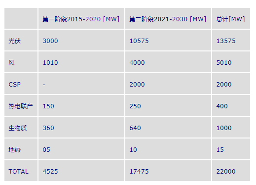 2015-2030期間為滿足全國市場需求而實現的可再生能源計劃的一致性為22,000兆瓦,其中到2020年將達到4,500兆瓦以上。