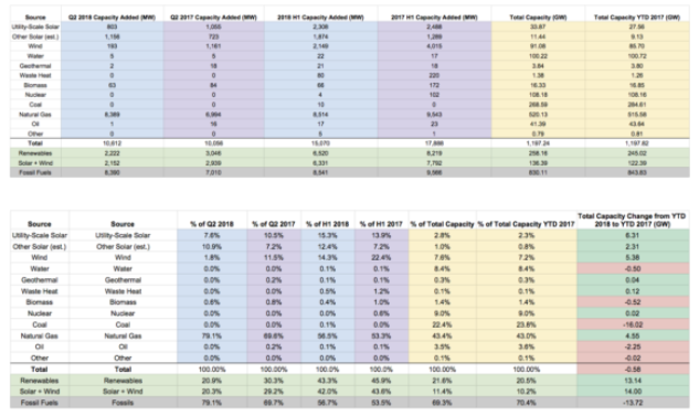 在2018年上半年,這些數字更好,但仍不如2017年那么好??稍偕茉凑荚搰略鲭娏θ萘康?3%,低于2017年上半年的46%。(Solar +)風力占全國新增電力容量的42%,低于2017年上半年的44%。)