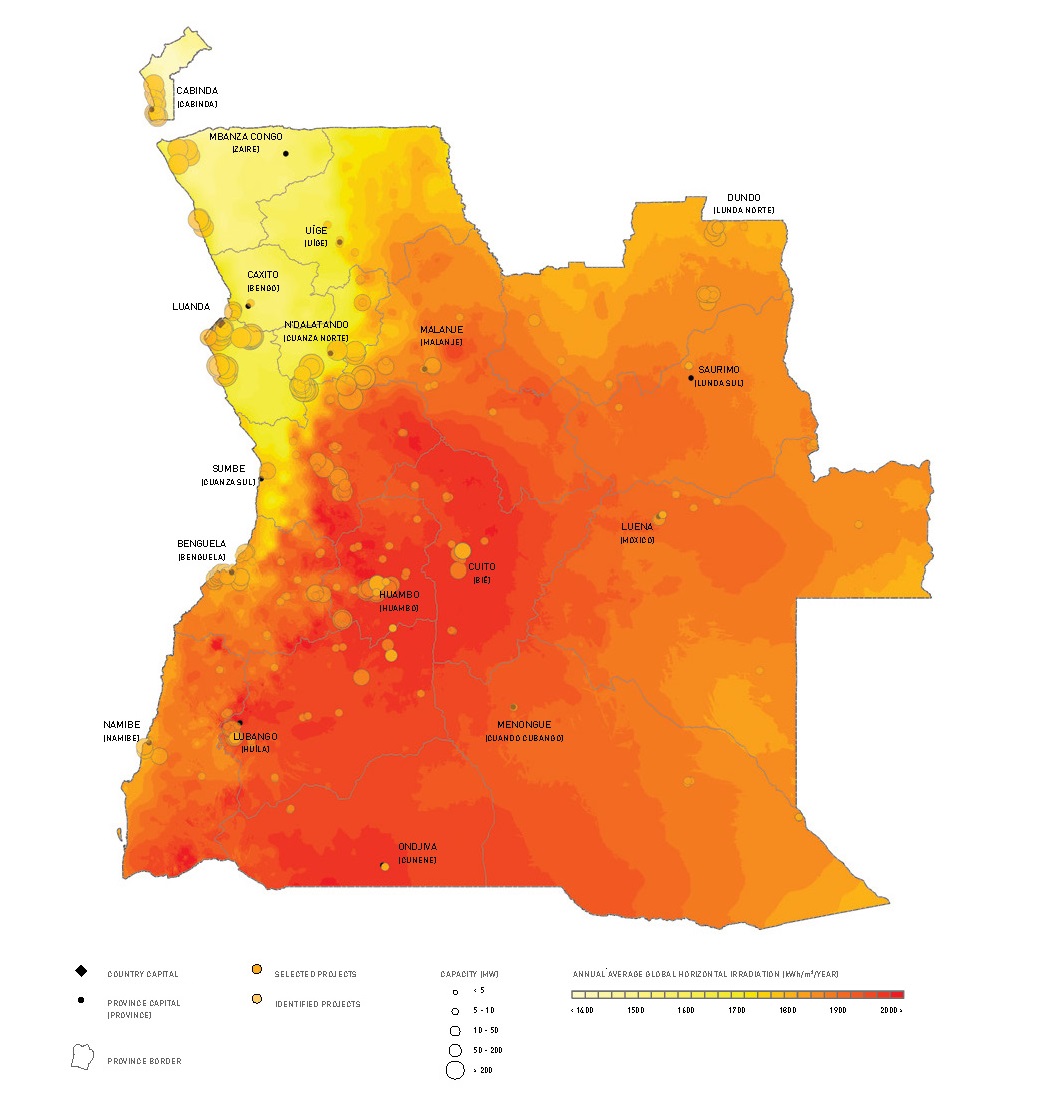 下圖顯示了安哥拉太陽能資源圖集以及確定具有安裝多個太陽能光伏項目GW的巨大潛力的各個地點。它還包括選擇用于安裝連接到主電網(wǎng)的78兆瓦的站點,包括中型和大型項目,這些都是達到既定的100兆瓦目標所必需的。這些地點的選擇是因為它們的能源成本較低,主要位于該國的中部和南部。