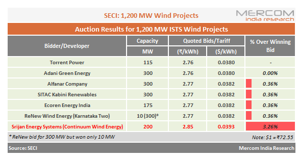 Mercom 之前曾報道,9個項目開發(fā)商提交了總計2,190兆瓦的技術出價,其中SECI的Tranche-V ISTS連接風電標簽的容量為1200兆瓦。