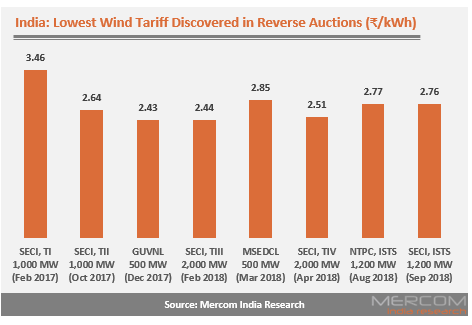 在印度太陽能公司(SECI)進行的1200兆瓦Tranche-V風力拍賣中,出現(xiàn)了?2.76(~0.038美元)/千瓦時的中標關稅。