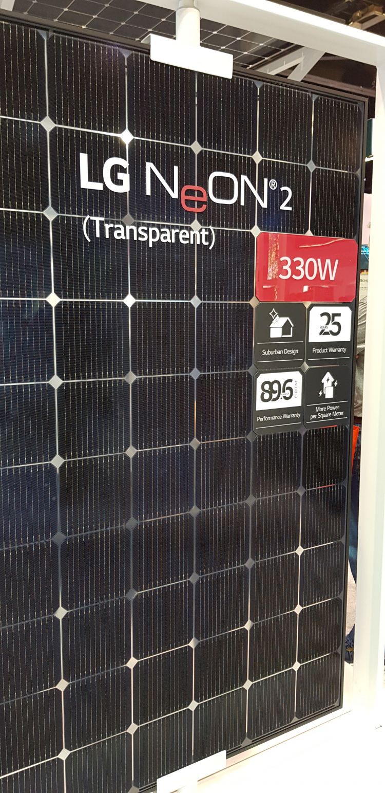 LG電子在SPI 2018上展示了其“NeON 2”系列面板,其中包括透明底片??,通過(guò)將屋頂顏色與細(xì)胞間距混合,改善了住宅系統(tǒng)的美觀。圖片:PV Tech