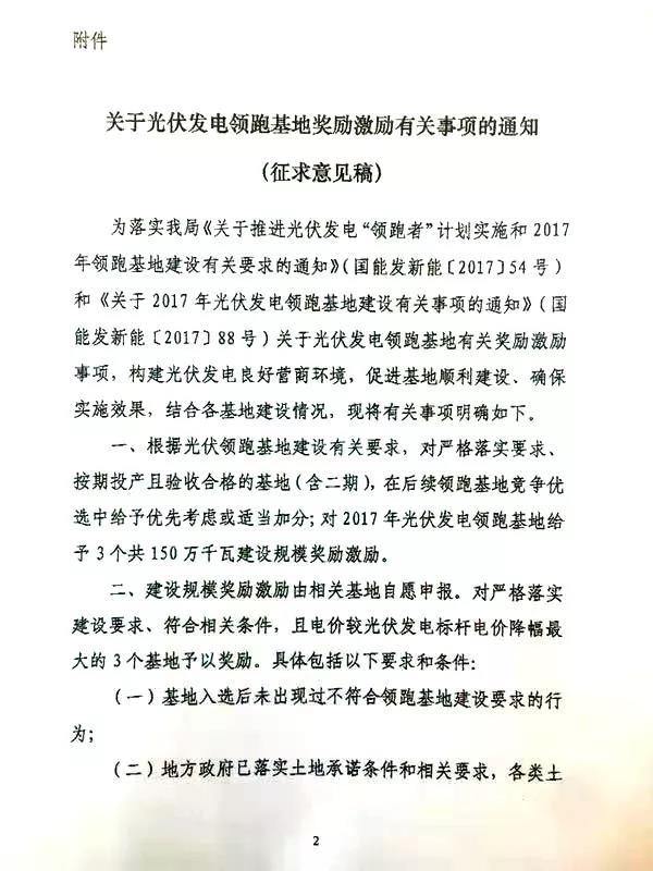 從國家能源局綜合司處獲悉,該局在日前印發了征求《關于光伏發電領跑基地獎勵有關事項的通知》意見的函,就國能發新能【2017】54號中提出的領跑者基地獎勵事宜征求相關發改委(能源局)的意見。
