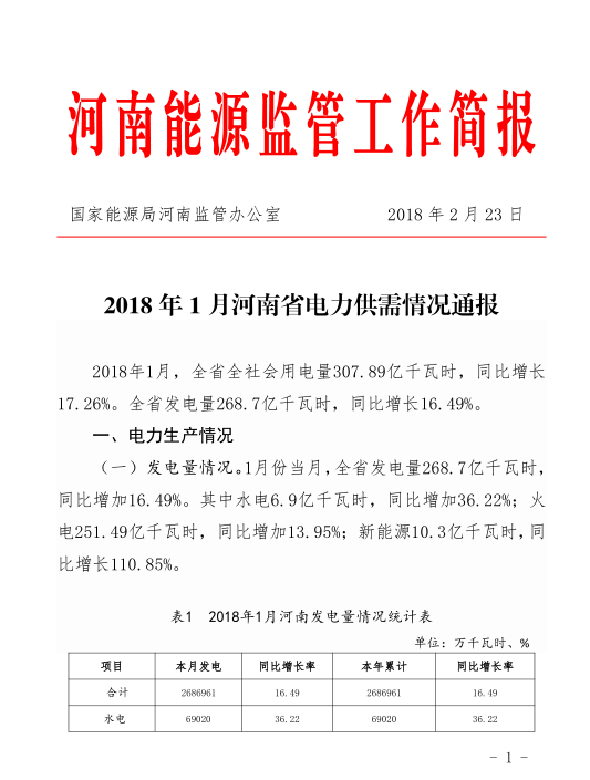 據(jù)悉,國家能源局河南監(jiān)管辦發(fā)布了《2018年1月河南省電力供需情況通報(bào)》。2018年1月,河南全省發(fā)電量268.7億千瓦時(shí),同比增加16.49%。其中新能源10.3億千瓦時(shí),同比增長110.85%。截止1月底,全省機(jī)組平均利用小時(shí)數(shù)334小時(shí),同比增加21小時(shí)。其中新能源為91小時(shí),同比增加1小時(shí)。截止1月底,全省裝機(jī)容量8042.14 萬千瓦,同比增加裝機(jī)717.5萬千瓦。其中新能源裝機(jī)1136.61萬千瓦,占比14.13%。
