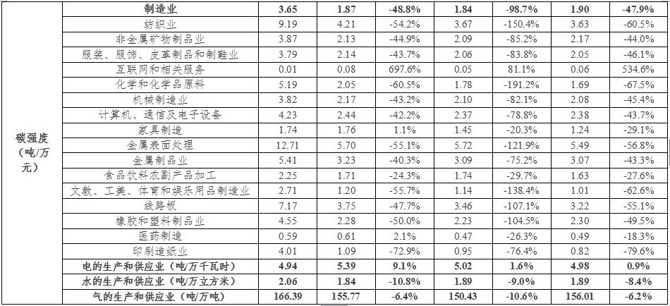 這說明,在碳市場機制的作用下,傳統行業原有的粗放式發展模式得到了約束,自然地遵從經濟規律調整企業的產品結構,在單位增加值下能耗比最低,或者在單位能耗下增加值最高,最終實現了排放量和排放強度的雙重下降。
