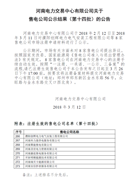 河南電力交易中心日前發布了關于售電公司公示結果(第十四批)的公告,公告中稱,未收到8家售電公司的異議,注冊手續自動生效。詳情如下: