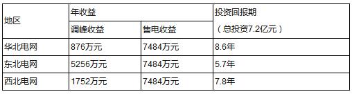 同樣以橋?yàn)匙冸娬?20MW/240MWh獨(dú)立儲(chǔ)能電站為例,假設(shè)一天參與兩次調(diào)峰,且儲(chǔ)存的電量在用電高峰時(shí)段按照風(fēng)電上網(wǎng)電價(jià)賣出(按0.5元/kWh計(jì)算),充放電效率90%,一年按365天計(jì)算,則不同地區(qū)的收益情況如下表: