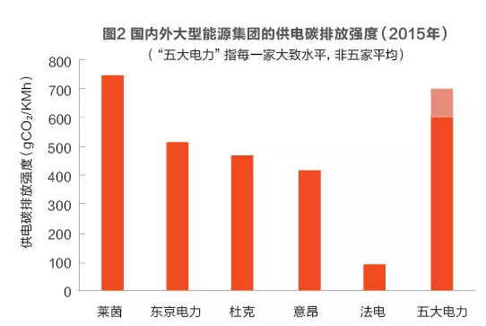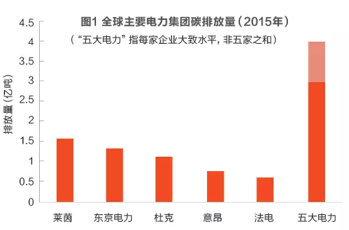 全球主要發(fā)電集團(tuán),包括法國(guó)電力(EDF)、意昂集團(tuán)(E.ON)、杜克能源(Duke Energy)、萊茵集團(tuán)(RWE)、東京電力(TEPCO),2015年各自碳排放總量大約在0.5~1.5億噸二氧化碳當(dāng)量的水平,同期中國(guó)的五大發(fā)電集團(tuán),每一家的碳排放總量均在3~4億噸二氧化碳當(dāng)量的水平(圖1),遠(yuǎn)高于全球主要發(fā)電集團(tuán)的水平,相當(dāng)于一個(gè)中等規(guī)模的發(fā)達(dá)國(guó)家的排放量(如英國(guó)),在排放量上可謂“富可敵國(guó)”。