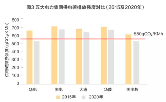2016年發(fā)布的《“十三五”控制溫室氣體排放工作方案》要求2020年大型發(fā)電集團(tuán)單位供電二氧化碳排放控制在550克二氧化碳/千瓦時(shí)以內(nèi),根據(jù)對(duì)五大發(fā)電集團(tuán)已經(jīng)公開(kāi)的“十三五”規(guī)劃部分?jǐn)?shù)據(jù)進(jìn)行測(cè)算,預(yù)計(jì)兩家有望完成指標(biāo)要求(國(guó)電投、華電),另外三家需要付出艱巨的努力,但能否完成仍然不容樂(lè)觀(圖3)。此外,《電力發(fā)展“十三五”規(guī)劃(2016-2020年)》同時(shí)提出,30萬(wàn)千瓦級(jí)以上具備條件的燃煤機(jī)組全部實(shí)現(xiàn)超低排放,煤電機(jī)組二氧化碳排放強(qiáng)度下降到865克/千瓦時(shí)左右的目標(biāo)。