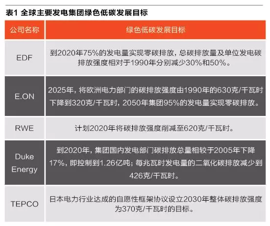 ?第二,規(guī)劃引領(lǐng),確立以“碳”為統(tǒng)領(lǐng)的發(fā)展目標(biāo)。落實(shí)碳排放管理,推行以“碳”為統(tǒng)領(lǐng)的發(fā)展目標(biāo)必須成為發(fā)電集團(tuán)實(shí)現(xiàn)總體戰(zhàn)略目標(biāo)的重要抓手。目前,全球主要發(fā)電集團(tuán)均確立了各自的碳排放控制目標(biāo)(表1)。中國(guó)大型發(fā)電集團(tuán)也不甘落后,以華能集團(tuán)為例,早在2010年的《華能集團(tuán)綠色發(fā)展行動(dòng)計(jì)劃》中,即提出到2020年集團(tuán)供電碳排放強(qiáng)度降至525gCO/KWh(目前看來(lái),這個(gè)指標(biāo)完成的難度不小)、清潔能源裝機(jī)達(dá)到35%的低碳發(fā)展目標(biāo)。華電集團(tuán)在2017年集團(tuán)年度工作會(huì)議上,提出到2020年單位電能碳排放指標(biāo)較“十二五”末降低20%、單位電能化石能源消耗降低20克的低碳發(fā)展目標(biāo),引領(lǐng)集團(tuán)低碳發(fā)展新方向。
