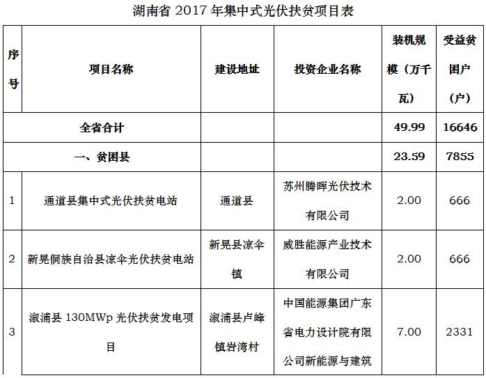 共49.99萬kw!湖南省公示2017年集中式光伏扶貧項目