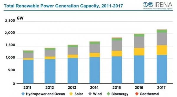 國際可再生能源機構(IRENA)發(fā)布的新數(shù)據(jù)顯示,2017年全球可再生能源發(fā)電容量增加167GW,達到2179GW。 這意味著一年約增長8.3%。